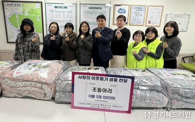 [경기헤드라인=김윤종 기자] 보산동 행정복지센터는 지난 18일 동두천시 송라마을 상가 대표와 사회복지공무원들로 구성된 봉사모임 ‘조동아리’(회장 김도연)가 관내 저소득 취약계층을 위해 이불 5채를 기탁했다고 밝혔다.