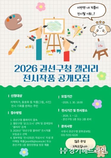 [경기헤드라인=문수철 기자] 수원시 권선구는 1월 30일까지 2026년 권선구청 갤러리 전시작품을 공개모집한다.