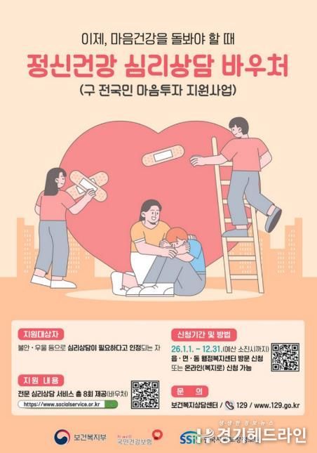 [경기헤드라인=김홍량 기자] 파주시는 시민의 정신질환 예방과 마음건강 안전망 강화를 위해 ‘정신건강 심리상담 바우처사업’의 서비스 제공기관을 모집한다.