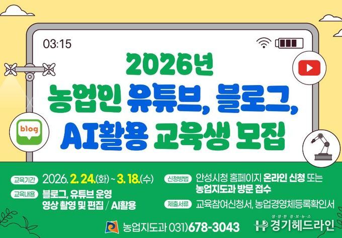 [경기헤드라인=문수철 기자] 안성시농업기술센터는 지역 농업인의 디지털 매체 활용 능력을 높이고 농산물 홍보 역량을 강화하기 위해 ‘2026년 농업인 유튜브·블로그·AI 활용 교육’ 교육생을 모집한다. 이번 교육은 블로그 운영뿐만 아니라 인공지능(AI)과 유튜브 동영상을 접목한 실전형 교육 과정으로 구성됐다.