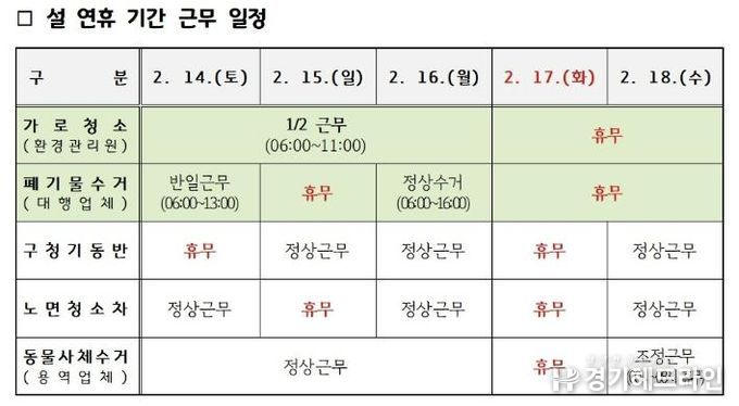 장안구 관계자는 “설 연휴 기간에도 청소 공백이 발생하지 않도록 철저히 대비하고 있다”며 “구민 여러분께서도 쓰레기 배출일과 배출 방법을 준수해 쾌적하고 즐거운 명절을 함께 만들어 주시길 바란다”고 말했다.
