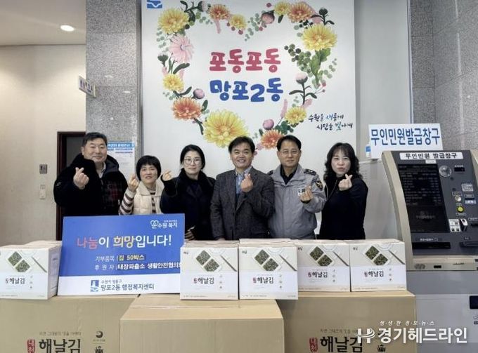 [경기헤드라인=문수철 기자] 영통구 망포2동 행정복지센터는 지난 2일, 태장파출소 생활안전협의회가 설 명절을 맞아 저소득 가정을 지원하기 위해 김 50박스를 망포2동 행정복지센터(동장 이용태)에 기탁했다고 밝혔다.