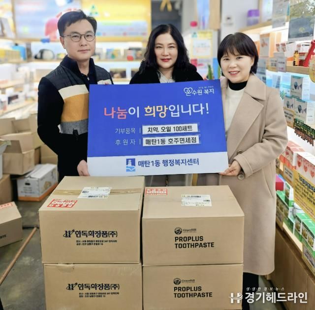 [경기헤드라인=문수철 기자] 영통구 매탄1동 행정복지센터는 지난 3일 호주면세점직영할인점 매탄점이 설 명절을 맞이해 매탄1동 행정복지센터에 프로폴리스 치약 100개, 오일 관절크림 100개를 후원했다고 밝혔다.