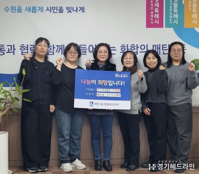 [경기헤드라인=문수철 기자] 수원시 영통구 매탄3동은 지난 3일 매탄3동 7, 8, 9, 13, 37통장 일동이 설 명절을 맞아 관내 어려운 이웃들에게 온누리상품권 50만원을 기부했다고 밝혔다.