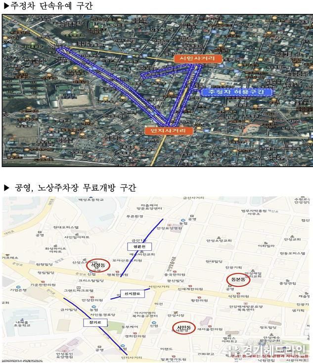 주정차 단속 유예 구간은 안성맞춤시장(서인사거리~인지사거리 구간 양측 300미터)과 중앙시장(서인사거리~안성농협 양측 100미터, 석정삼거리~인지사거리 양측 500미터) 주변 도로이며, 서인동·동본동·석정동의 건축식 공영주차장과 전통시장 주변 노상주차장이 무료 개방된다.