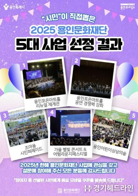 [경기헤드라인=문수철 기자] 용인문화재단은 시민 참여 온라인 투표를 통해 ‘시민이 선정한 2025년 용인문화재단 5대 사업’을 발표했다.