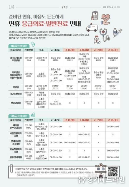 [경기헤드라인=김홍량 기자] 포천시는 오는 14일부터 18일까지 설 연휴 기간 동안 시민들이 안정적으로 의료서비스를 이용할 수 있도록 응급대응체계를 강화한다.