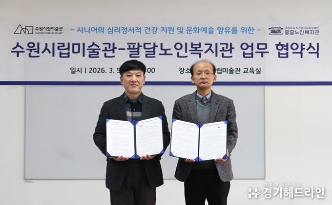 [경기헤드라인=문수철 기자] 경기도 수원시립미술관과 수원시 팔달노인복지관은 5일 관내 시니어의 문화예술 향유 활성화를 위한 업무협약을 체결했다.
