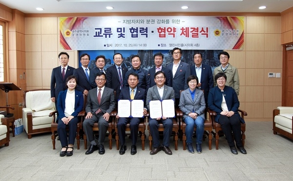 [경기헤드라인=문수철 기자] 경기도의회 의회운영위원회(위원장 김종석)는 25일 광주광역시의회 의회운영위원회(위원장 이정현)와 지방자치와 분권 강화를 위한 교류 및 협력협약을 체결했다.