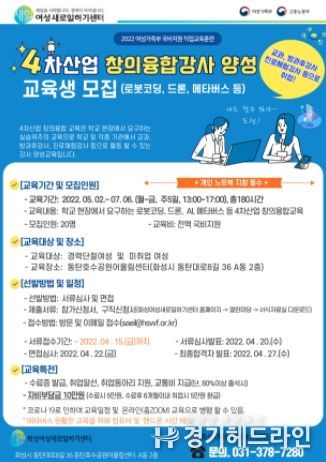 [경기헤드라인=문수철 기자] (재)화성시여성가족청소년재단(대표이사 김경륜) 화성여성새로일하기센터는 여성가족부가 지원하는 직업훈련교육의 일환인 '4차산업 창의융합강사 양성과정' 교육생을 2022년 4월 15일까지 모집한다.