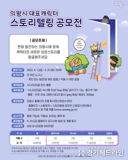 [경기헤드라인=방극율 기자] 의왕시가 5월 31일까지 전 국민을 대상으로 ‘대표캐릭터 스토리텔링 공모전’을 개최한다고 5일 밝혔다.