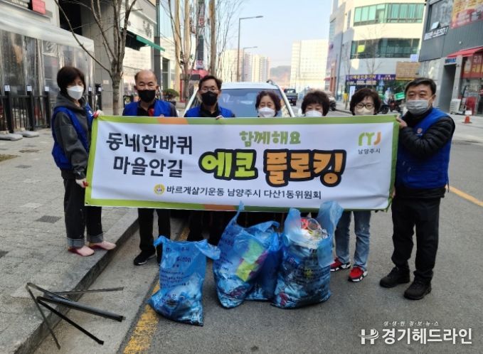 [경기헤드라인=유수상 기자] 바르게살기운동 남양주시협의회 다산1동위원회(위원장 김수영)는 지난 5일 다산1동 다산선형공원 주변 상가 일대에서 에코플로깅(Eco-plogging) 활동을 펼쳤다.