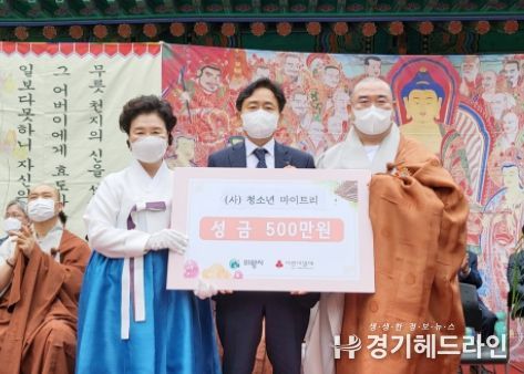 성행 주지 스님은 “부처님이 이 땅에 오신 뜻을 실천하기 위해 소년소녀가장돕기, 청소년 지도 등에 앞장서고 있는 마이트리의 이름으로 기부를 하게 되었다”고 전했다.