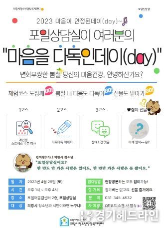 [경기헤드라인=문수철 기자] 의왕시청소년상담복지센터(센터장 정부순) 포일상담실에서는 마음안정을 위한 코스별 체험활동이 접목된 ‘2023 마음이 안정된데이(day)’를 운영한다.