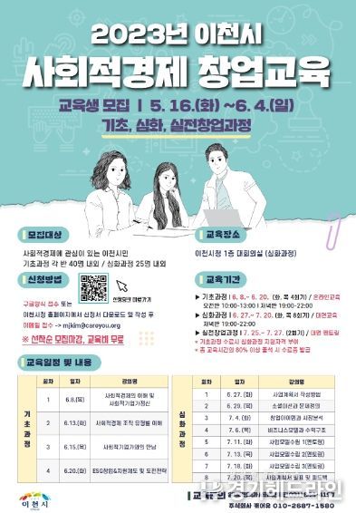 [경기헤드라인=정현수 기자] 이천시가 사회적 경제조직에 관심있는 예비창업자들을 위하여 “2023 사회적 경제 창업교육” 을 운영한다.