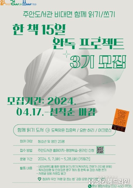프로그램은 SNS 공간에서 독서전문지도자가 리더로 참여해 함께 읽고 감상을 나누며 5월 7일부터 독서를 진행한다. 3기 비대면 함께 읽기 도서는 요한 하리가 쓴 ‘도둑맞은 집중력’으로 완독 후에는 서평 쓰기로 마무리하며 독서의 감상을 깊이 있게 나눌 예정이다. 활동 기간 남긴 서평은 발췌해 주안도서관 서평집에 수록‧발간한다.