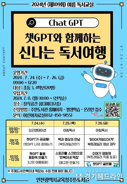 [경기헤드라인=문수철 기자] 인천광역시교육청주안도서관은 여름방학을 맞아 관내 초등학교 3학년부터 4학년 학생 20명을 대상으로 24일부터 26일까지 ‘챗GPT와 함께하는 신나는 독서 여행’ 여름 독서교실을 운영한다.