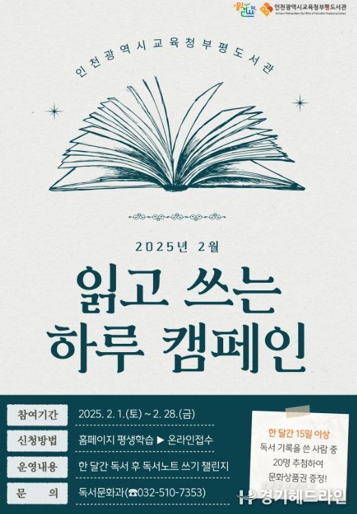 [경기헤드라인=문수철 기자] 인천광역시교육청부평도서관은 읽걷쓰 문화 확산을 위해 2월 한 달간 ‘읽고 쓰는 하루 캠페인’ 참여자를 모집한다.