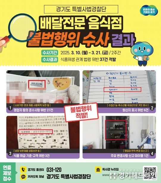 기이도 경기도 특별사법경찰단장은 “식사자리가 없고 조리공간이 개방돼 있지 않은 배달전문점 특성상 위생관리에 취약할 수 있다”며 “이번 수사를 통해 도민이 안심하고 구매하는 소비환경을 조성했다”라고 말했다.