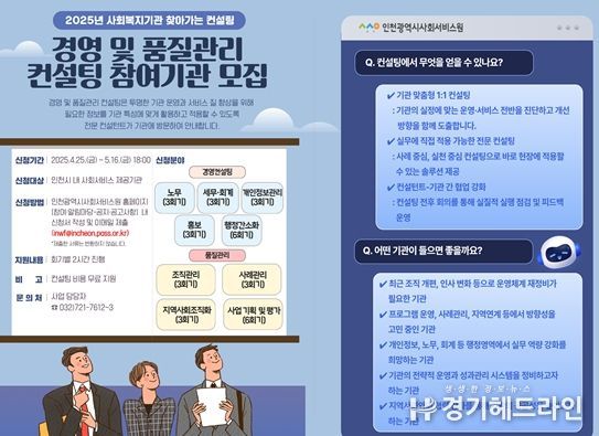 [경기헤드라인=문수철 기자] 인천시사회서비스원는 경영·품질관리 맞춤형 컨설팅에 참여할 지역 내 사회서비스 제공기관을 모집한다고 8일 밝혔다.