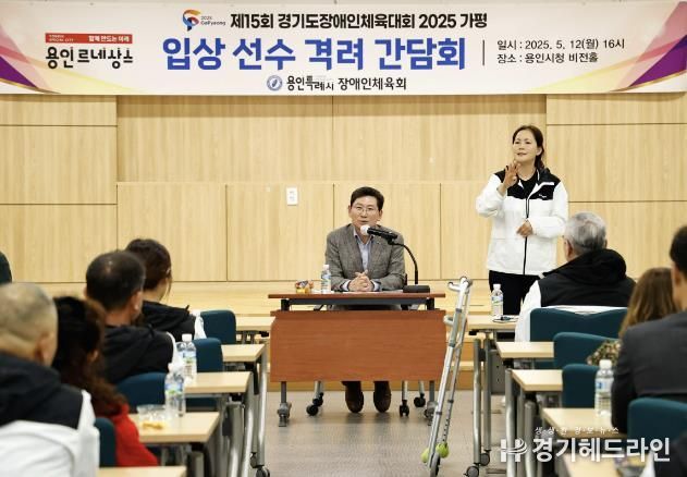 [경기헤드라인=문수철 기자] 이상일 용인특례시장은 12일 오후 시청 비전홀에서 ‘제15회 경기도장애인체육대회’ 입상자와 지도자들에게 메달을 전수하고, 성과를 축하했으며 장애인 선수단의 의견을 듣는 시간을 가졌다.