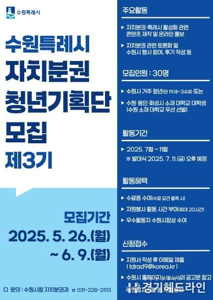 [경기헤드라인=문수철 기자] 수원특례시가 자치분권·특례시 활성화 관련 콘텐츠를 제작하고, 온라인으로 홍보하는 활동을 하는 ‘수원특례시 자치분권 청년기획단’을 6월 9일까지 모집한다.