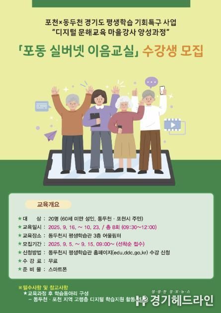 [경기헤드라인=김윤종 기자] 동두천시는 포천시와 공동으로 추진하는 경기도 평생학습 기회특구 사업의 일환으로 운영되는 '포동 실버넷 이음교실' 수강생을 모집한다고 밝혔다. 본 과정은 디지털 문해교육 강사를 양성해 고령층 등 디지털 소외계층이 정보화 사회에 적극 참여할 수 있도록 돕기 위해 마련됐다.