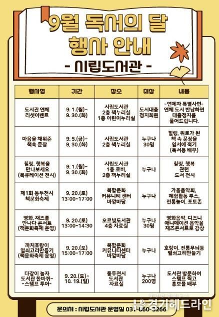 [경기헤드라인=김윤종 기자] 동두천시립도서관은 9월 한 달간 독서의 달을 맞아 시민들이 책과 함께 소통하고 즐길 수 있는 다양한 프로그램을 운영한다고 밝혔다.