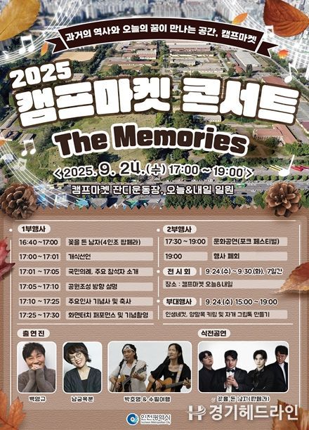 [경기헤드라인=문수철 기자] 인천광역시는 오는 9월 24일 오후 5시, 부평 캠프마켓 개방공간인 잔디운동장에서 ‘2025 캠프마켓 콘서트 The Memories’를 개최한다고 밝혔다.