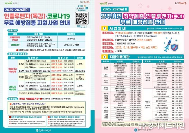 양주시 보건소 관계자는 “올해는 독감과 코로나19가 함께 유행할 수 있는 만큼 어르신, 어린이, 임신부 등 고위험군과 취약계층은 반드시 기간 내 접종을 완료하길 바란다”고 당부했다.