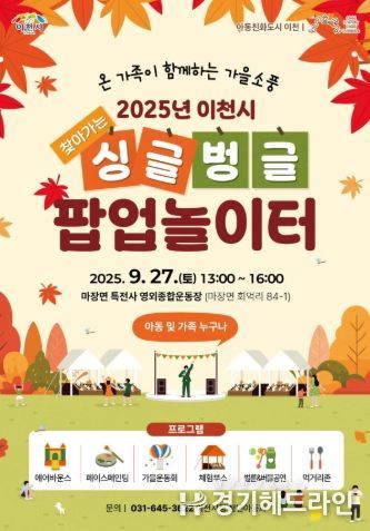 '찾아가는 싱글벙글 팝업 놀이터'는 계절별 콘셉트로 진행되는 가족 참여형 놀이문화 프로그램으로, 올해 총 3회에 걸쳐 운영된다. 지난 8월 진행된 1회차 ‘이천 CITY 바캉스’는 여름 물놀이와 공연, 워터게임 등 다양한 프로그램으로 성황리에 마무리됐으며, 2회차는 가을을 테마로 가족이 함께하는 가을소풍 콘셉트로 펼쳐진다.