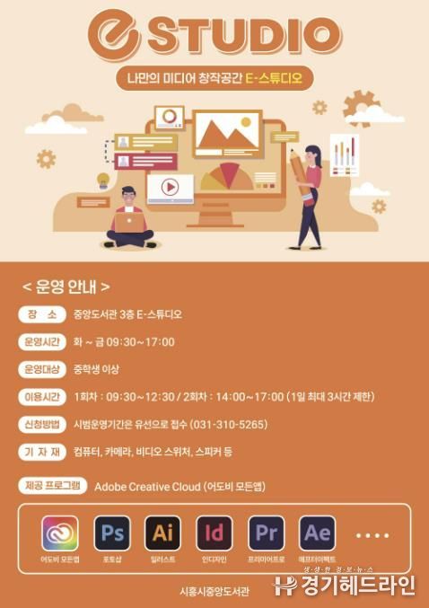 [경기헤드라인=문수철 기자] 시흥시중앙도서관은 시민들의 미디어 창작활동을 적극 지원하기 위해 도서관 3층에 위치한 e-스튜디오에 어도비 크리에이티브 클라우드(Adobe Creative Cloud)를 도입해 오는 9월 25일부터 시범 운영을 시작한다.
