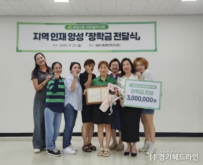 [경기헤드라인=문수철 기자] 시흥시 배곧1동 새마을부녀회는 지난 9월 22일 배곧1동 행정복지센터에서 지역 인재 양성을 위한 장학금 전달식을 하고, 관내 거주 중고등학생 3명에게 각각 100만 원씩, 총 300만 원의 장학금을 전달했다.