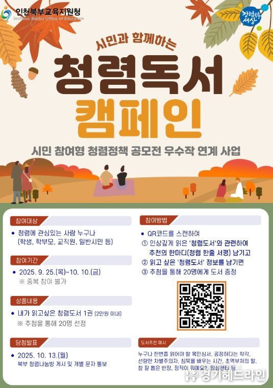 [경기헤드라인=문수철 기자] 인천북부교육지원청은 교직원·학생·학부모·시민 누구나 쉽게 참여할 수 있는 ‘청렴독서 캠페인’을 9월 25일부터 10월 10일까지 운영한다고 밝혔다.