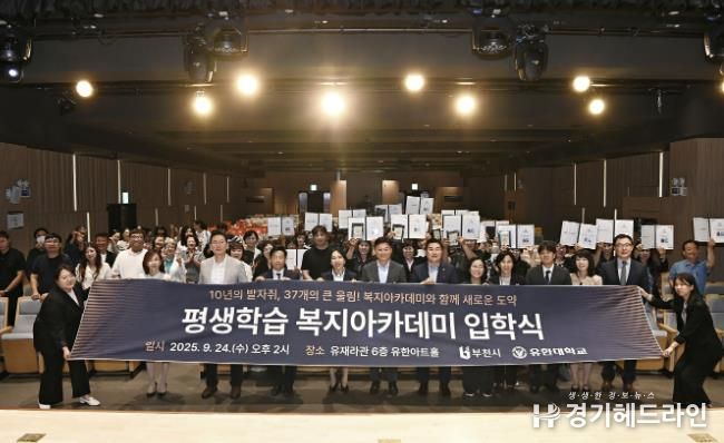 [경기헤드라인=문수철 기자] 부천시는 지난 24일 유한대학교에서 ‘부천시·유한대학교 복지아카데미’ 입학식과 업무협약식을 열었다. 이번 행사는 조용익 부천시장과 장은영 유한대학교 총장을 비롯해 37개 동 지역사회보장협의체 위원장 등 150여 명이 참석한 가운데 진행됐다.