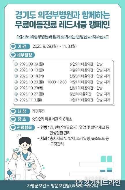 [경기헤드라인=문수철 기자] 가평군보건소는 수해지역 주민들의 건강 증진을 위해 경기도의정부병원과 함께 무료이동진료 사업인 레드서클 캠페인을 이달 29일부터 11월 3일까지 운영한다.
