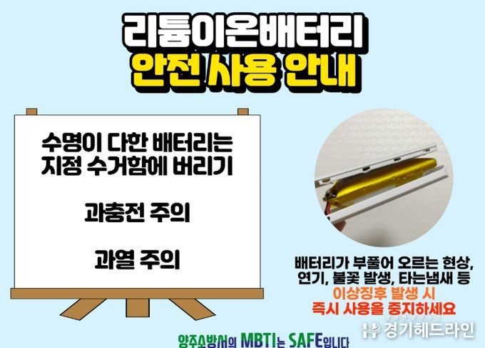 [경기헤드라인=김윤종 기자] 양주소방서는 리튬이온배터리의 안전한 사용을 유도하고 관련 화재 사고를 예방하기 위해, 시민 누구나 쉽게 이해할 수 있는 시각자료 형태의 안내 이미지를 제작해 홍보에 나섰다고 밝혔다.