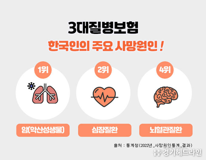 [경기헤드라인=] 3대질병으로 일컬어지는 암, 뇌혈관질환, 심혈관질환은 한국인의 주요 사망원인에서 상위를 차지하고 있으며, 이에 대한 진단비를 집중적으로 보장해 주는 보험상품을 3대질병진단비 보험이라 할 수 있다.