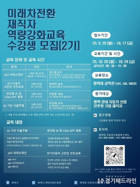 [경기헤드라인=문수철 기자] 평택시와 평택산업진흥원이 ‘미래차 전환 재직자 역량 강화교육’ 2기 과정을 개설한다. 교육은 10월 20일부터 24일까지 교육 운영기관인 평택대학교에서 진행되며, 지역 자동차 산업 재직자를 대상으로 미래차 핵심 분야 전문지식을 제공한다.