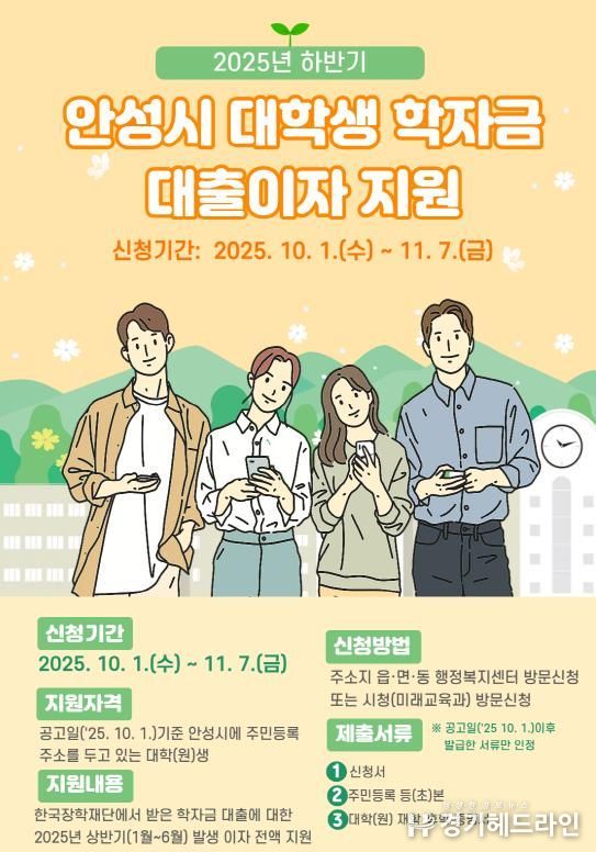 [경기헤드라인=문수철 기자] 안성시는 오는 10월 1일부터 11월 7일까지 ‘2025년도 하반기 안성시 대학생 학자금 대출이자’ 지원 신청을 받는다.