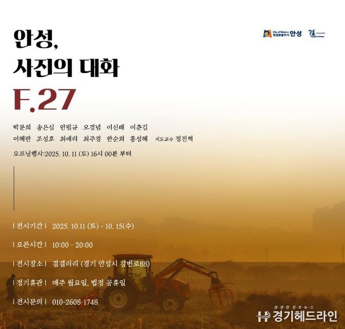 [경기헤드라인=문수철 기자] 안성시 사진동아리 F.27 photo가 오는 10월 11일부터 15일까지 안성천 작은미술관 결갤러리에서 전시회 ‘안성, 사진의 대화 F.27’을 개최한다. 이번 전시는 동아리 회원 18명이 참여해 안성의 자연환경과 사람들의 이야기를 기록한 작품을 선보인다.
