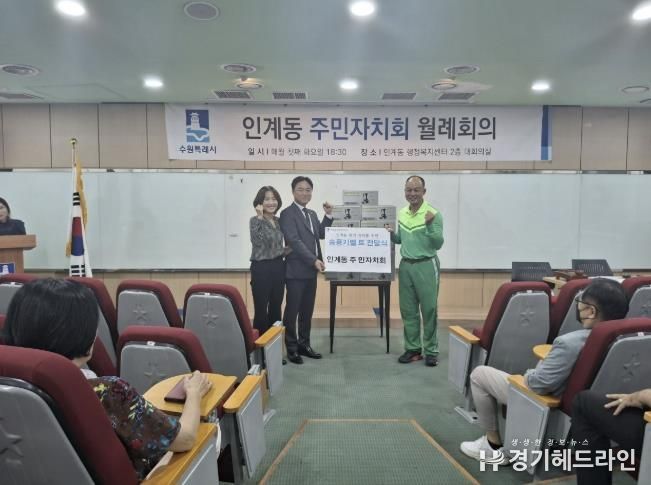 [경기헤드라인=문수철 기자] 수원시 팔달구 인계동 주민자치회는 지난 10월 1일, 가을철 관내 낙엽청소용 송풍기 벨트(100만 원 상당)를 인계동 행정복지센터에 전달했다.