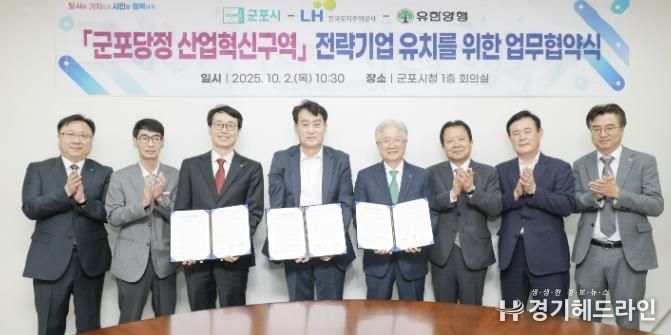 [경기헤드라인=문수철 기자] 군포시는 2일 군포시청에서 한국토지주택공사(LH), ㈜유한양행과 ‘군포당정 산업혁신구역’ R·D 전략기업 유치를 위한 업무협약을 체결했다고 밝혔다.