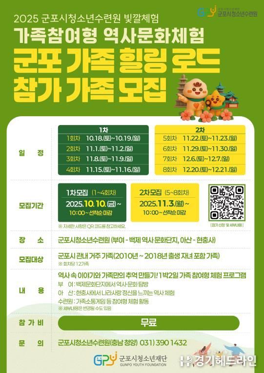 [경기헤드라인=문수철 기자] 군포시청소년재단이 운영하는 군포시청소년수련원(충남 청양)은 관내 가족을 대상으로 2025년 가족참여형 역사문화탐방 '군포가족 힐링로드' 참가자를 모집한다.