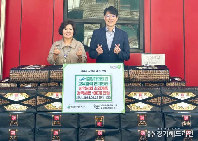 [경기헤드라인=문수철 기자] 남양주시는 지난달 29일 진접읍에 위치한 중앙대의료원 교육협력 현대병원이 추석을 앞두고 1,000만 원 상당의 정육세트 100개를 북부희망케어센터에 전달했다고 2일 밝혔다.