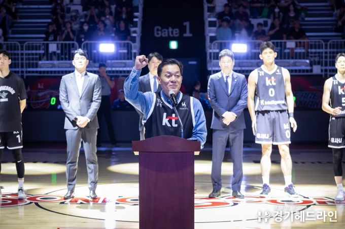 [경기헤드라인=문수철 기자] 이재준 수원특례시장이 4일 수원KT소닉붐아레나에서 열린 ‘2025-2026 프로농구 KBL 홈 개막전’에서 개막선언을 했다.