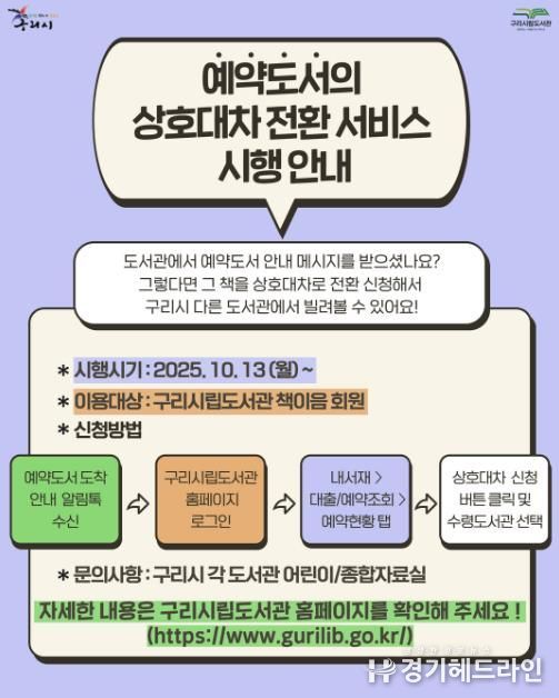 [경기헤드라인=문수철 기자] 구리시는 오는 10월 13일부터 시민들의 도서 이용 편의성을 높이기 위해‘시립도서관 예약 도서 상호대차 전환 서비스’를 새롭게 운영한다고 밝혔다.