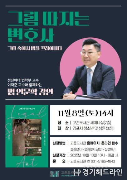 [경기헤드라인=문수철 기자] 김포시 고촌도서관에서 오는 11월 8일 오후 2시부터 4시까지 예술작품 속에 숨은 법률 이야기를 주제로 한 인문학 강연을 운영한다.