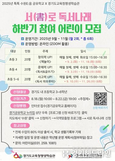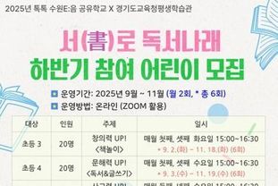 [경기헤드라인=문수철 기자] 경기도교육청평생학습관이 수원교육지원청과 함께 어린이 독서 습관 형성과 사고력 향상을 위하여 초등학교 3~6학년을 대상으로‘서(書)로 독서나래’를 운영한다.