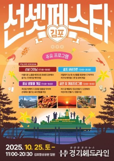 [경기헤드라인=문수철 기자] 아름다운 석양을 배경으로 선상 다이닝을 즐길 수 있는 특별한 축제가 김포에서 열린다. 오는 25일 단 하루, 토요일 오전 11시부터 밤 8시 30분까지 대곶면 김포함상공원 일원에서 ‘2025 김포 선셋 페스타 위드(with) 로컬푸드 다이닝’이 개최된다.